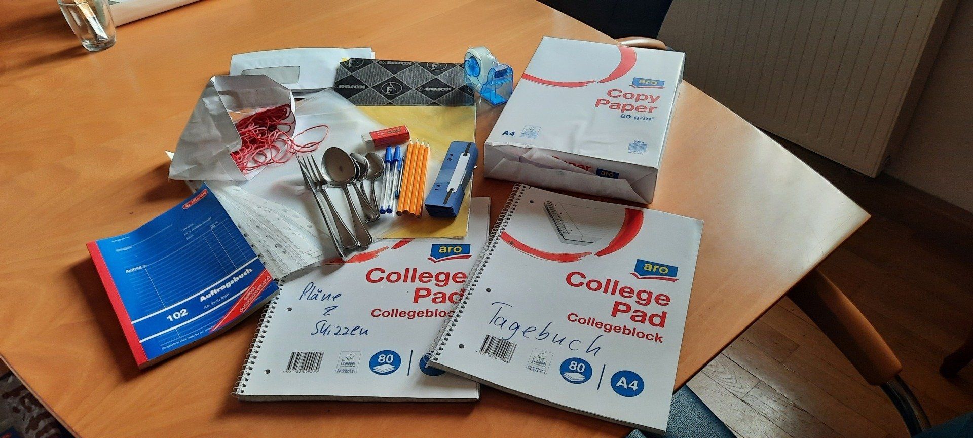 So luden wir auf unseren kleinen Piaggio Hinterkipper „Notfallbüros“, eine Grundausstattung, was man in einem Büro braucht, wenn es keinen Strom gibt: Papier, Bleistifte, Kuli-Ersatzminen, Spitzer, Radiergummi, aber auch Kohlepapier für handschriftliche Durchschläge und Locher.